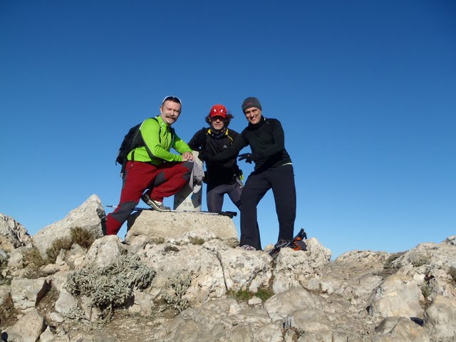 Como siempre en las cimas abrazos, fotos y unas naranjas para reponer un poco. Para la bajada hemos optado por la "ombría", esta zona está muy bien pisada y la baja es más cómoda que por la pedrera. Está muy arrasada y con la inclinación y la mala superficie para caminar no es recomendable.