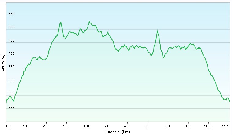 DESNIVEL POSITIVO: La cumbre está a 830 m. El inicio de la ruta en la carretera es de 527 m. Desnivel 300 m. Como desnivel acumulado tenemos 698 metros de subida.
