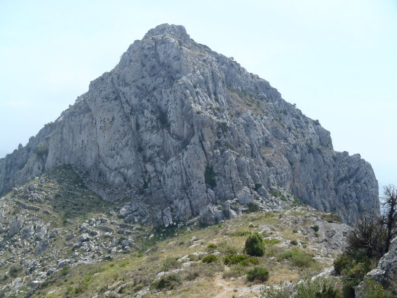 Hemos llegado muy frescos al “coll de Garga” y decidimos subir hasta la cima del pequeño cerro. Entre lascas de piedras y matorral bajo subimos en 10 minutos, una foto y de nuevo a retomar la pr ahora si como se puede ver en la imagen superior siguiendo la senda que recorre el alto de la sierra.